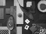 Aesthetic flat lay composition in grey and navy color palette with textile and paint samples, lamella panels, leaves and tiles. Architect and interior designer moodboard. Top view. Copy space.
