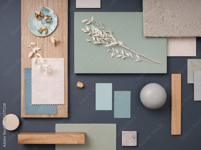 Elegant flat lay composition in green, blue and beige color palette with textile and paint samples, lamella panels and tiles. Architect and interior designer moodboard. Top view. Copy space.