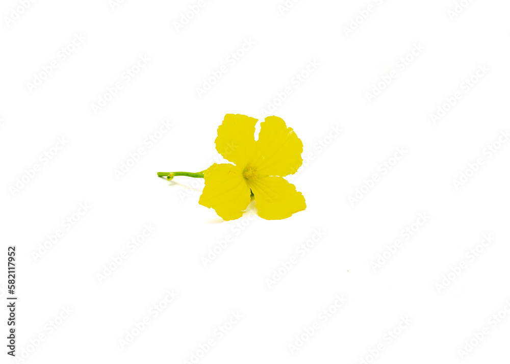 Yellow blooming luffa male flower, fresh cut homegrown loofah gourd blossom isolated on white background with clipping path, copy space