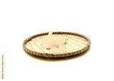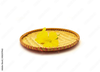 Handmade bamboo mat with two yellow blooming luffa male flowers, fresh cut loofah gourd blossom isolated on white background with clipping path, copy space