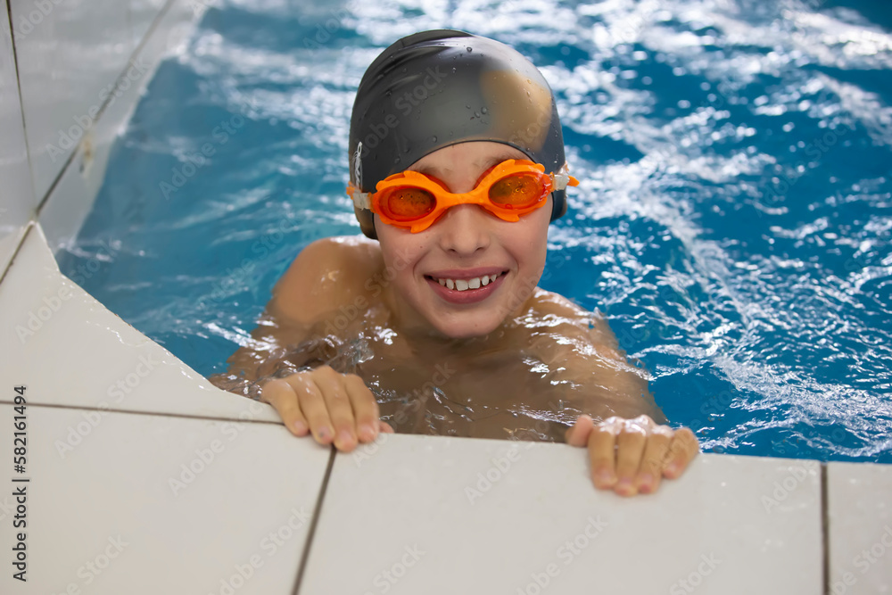 A boy in a swimming cap and goggles in the pool. He smiles and looks into the camera. Child in the sports pool.
