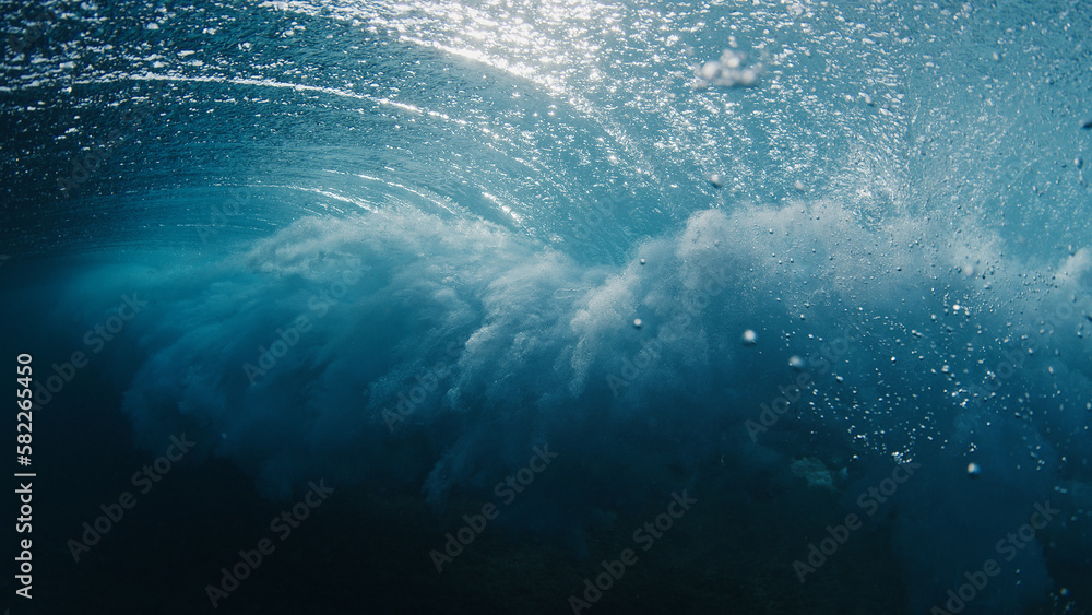 Underwater view of the ocean wave breaking on the shore in the Maldives