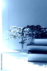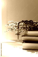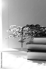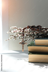 christian rosary cross, old biblical books and willow branches on table close up, abstract light background. Orthodox palm Sunday, Easter holiday. Symbol of Christianity, Lent, Faith in God, Church.