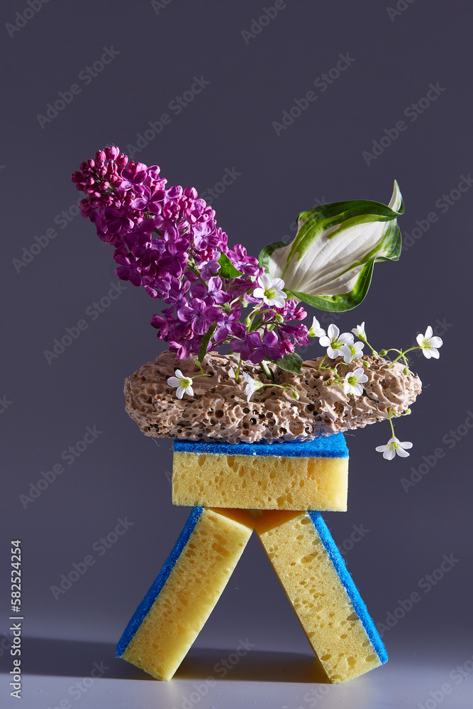 Creative composition of sponges, wood and flowers. Advertisement idea. Copy space