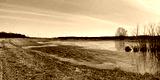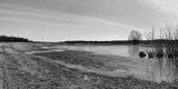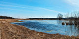Early spring, river flood on agricultural meadows. Reflection in submerged fields covered by water. Seasonal overflow. Rural sunny Panorama.