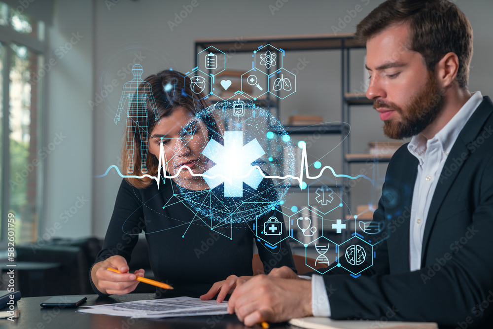 Businesspeople in formal wear taking notes signing contract at office workplace. Concept of important working moments, document sign, working process, concentration. Medical icons hologram