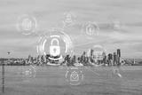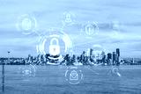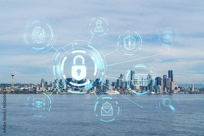 Seattle skyline with waterfront view. Skyscrapers of financial downtown at day time, Washington, USA. The concept of cyber security to protect confidential information, padlock hologram