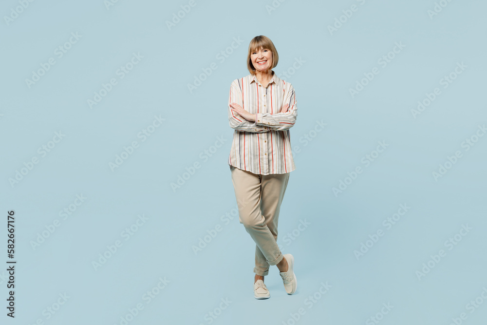 Full body smiling happy fun elderly woman 50s years old wear shirt hola hands crossed folded look camera isolated on plain pastel light blue cyan color background studio portrait. Lifestyle concept.