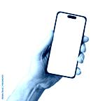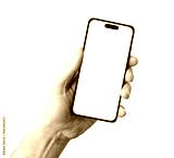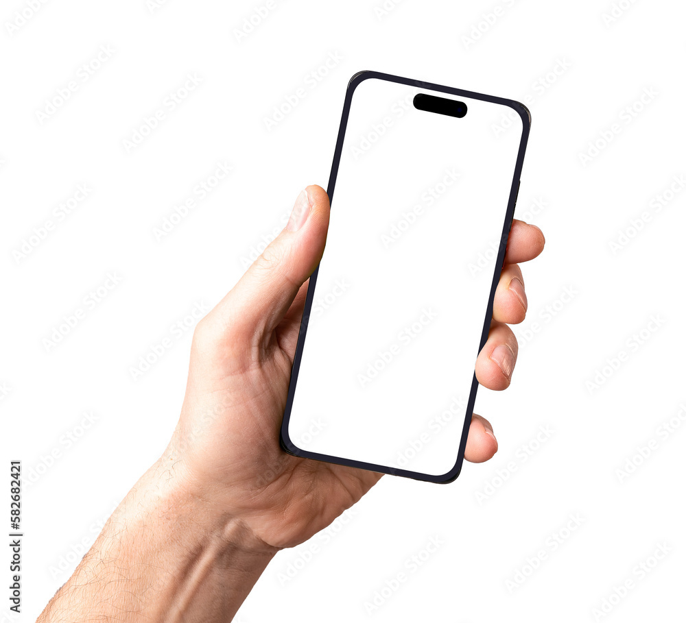 Lodz, Poland March 07 2023 Mobile phone screen mockup in male hand. Smartphone display mock-up isolated on white background