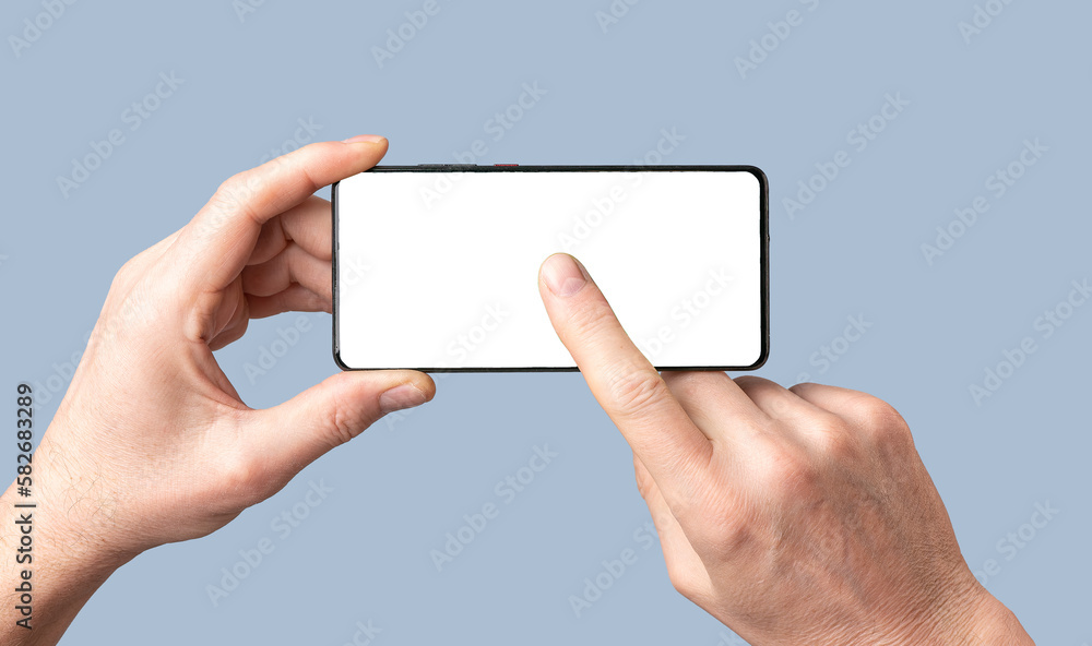 Mobile phone screen mock-up. Hands holding cellphone, pressing, clicking, touching play on smartphone screen display mockup
