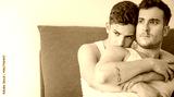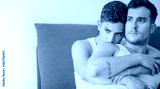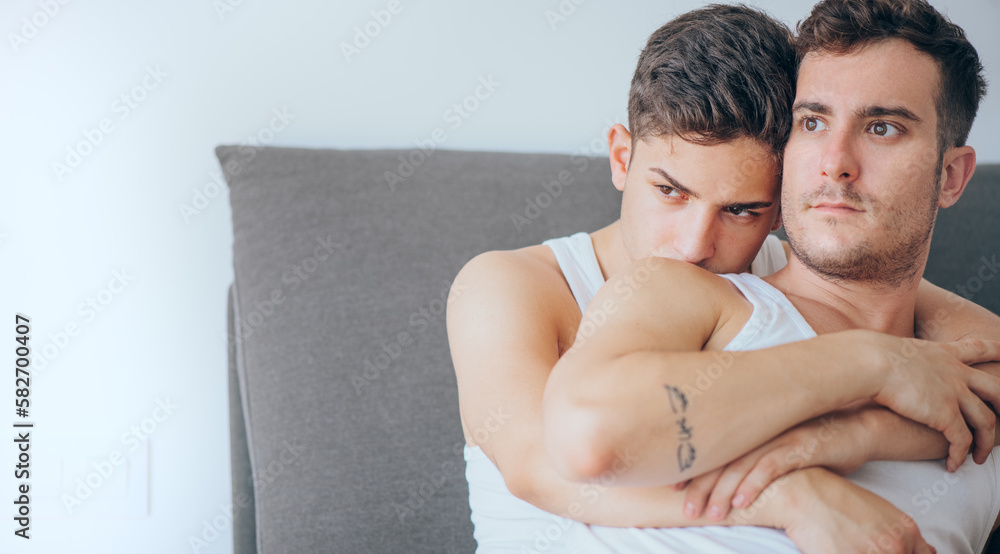 Gay couple portrait, lying in bed, hugging. Men Couple together, LGBT family. Homosexual male relationships, LGBTQ. Boyfriends in love.