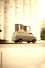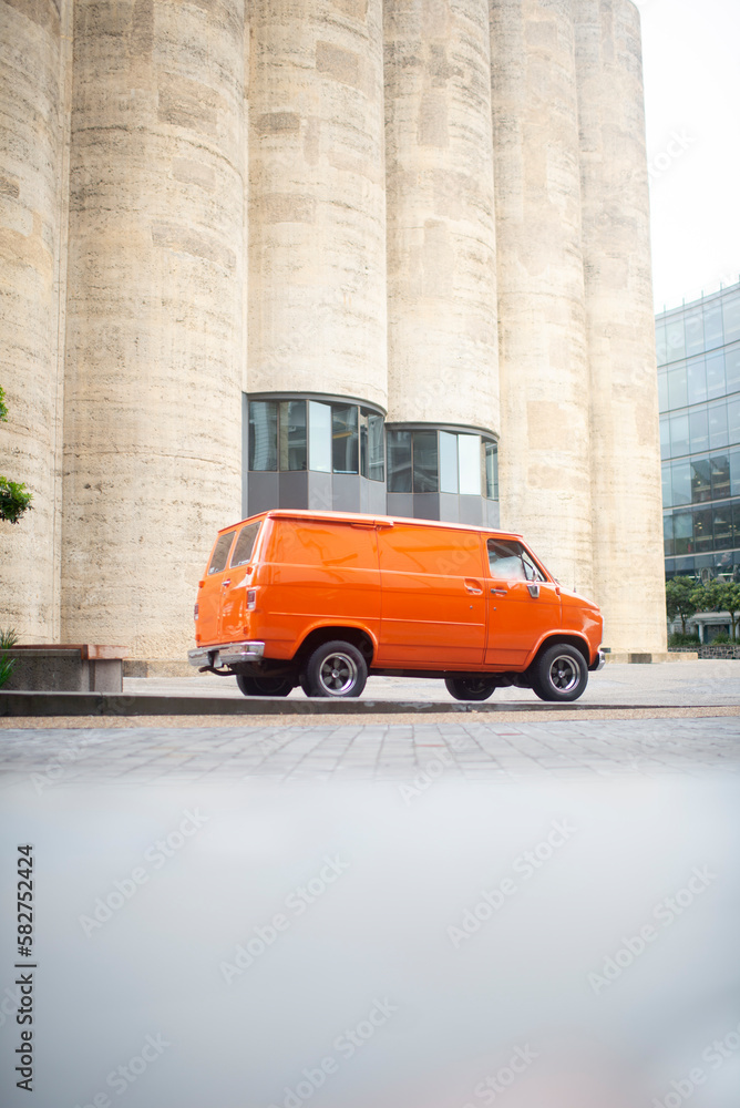 Orange 70’s boogie van rear 3/4 view portrait, with tall concrete backdrop