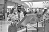 young attractive man and woman using digital navigation board to search information about shops, floors. close up side view shot