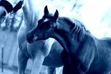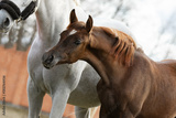 Young pretty arabian horse foal and his mother on summer background, portrait closeup