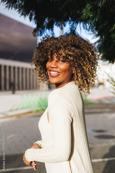 portrait of millennial afro latin woman smiling to the camera