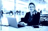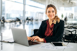Successful confident caucasian business woman dressed in elegant wear, executive, recruitment, product manager, sits in a modern office, works in a laptop, looks at camera, smiling friendly