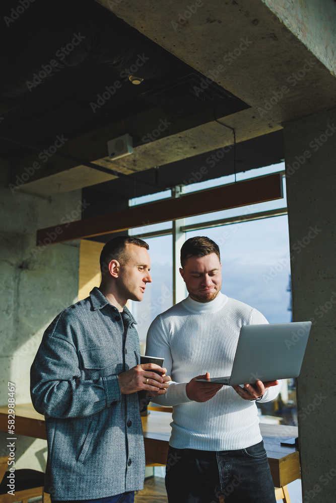 Work of two male colleagues standing in office together while exchanging ideas with laptop in meeting room and analyzing work schemes. Work in a modern, spacious office