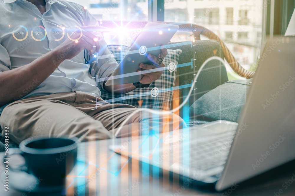 Businessman working on digital tablet new business project working from coffee shop. Marketing plan and analyzing sales to come up with strategies for marketing to increase, investment