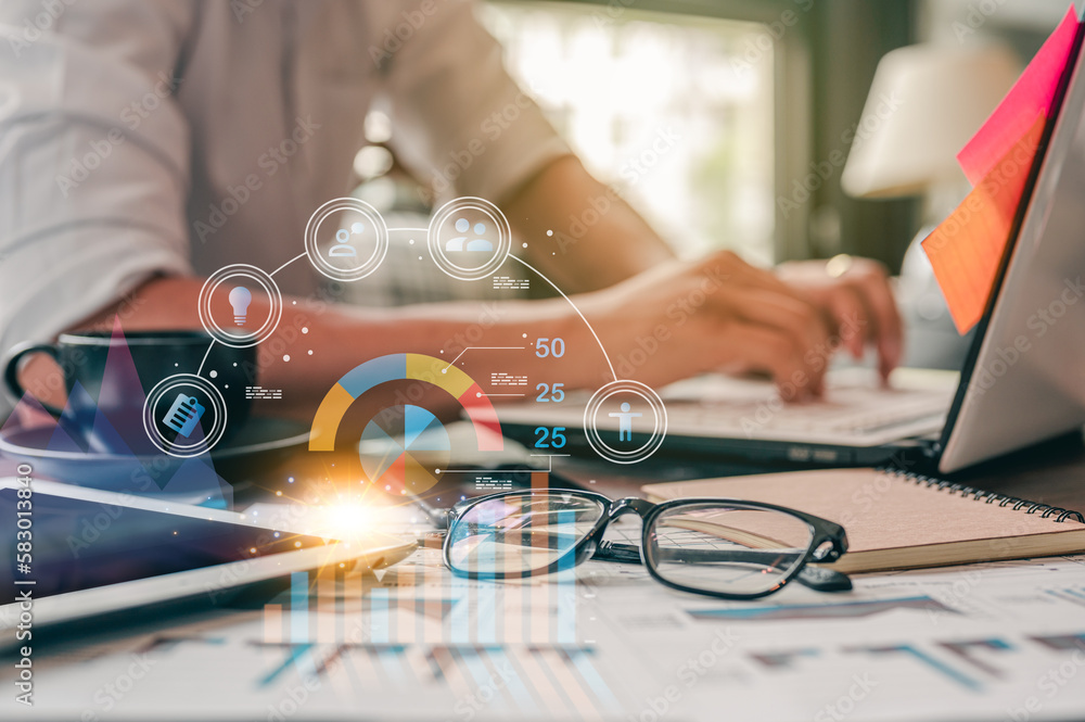 Businessman working on laptop new business project. Concept Innovation, inspiration, creative solution idea for modern business intelligence technology. Success creativity invention, thinking