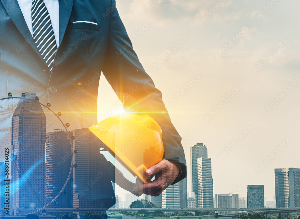 Engineer holding yellow helmet for workers security on background of new high rise apartment buildings and construction on background of evening sunset cloudy sky. Business
