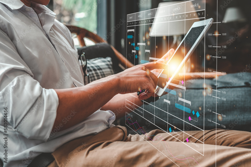 Businessman working on digital tablet new business project working from coffee shop. Marketing plan and analyzing sales to come up with strategies for marketing to increase, investment graph