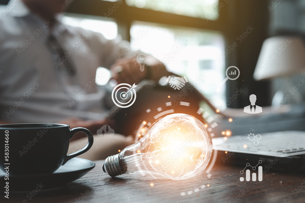 Light blub on the table.Concept Innovation, inspiration, creative solution idea for modern business intelligence technology.Success creativity invention, thinking imagination digital marketing online.