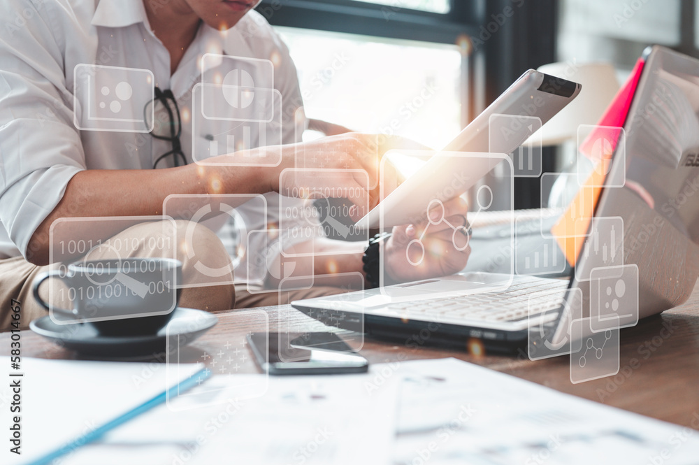 Businessman working on digital tablet new business project working from coffee shop. Marketing plan and analyzing sales to come up with strategies for marketing to increase,investment graph