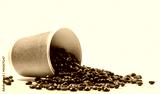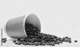 Bringing energy to your mornings. Studio shot of a tipped over paper cup filled with coffee beans against a white background.