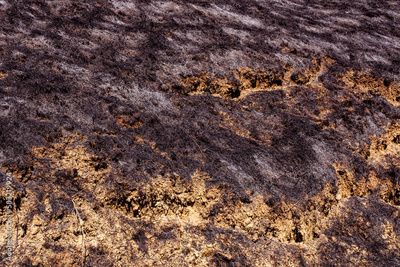 Burnt forest floor undergrowth with grass and ash, forest fire