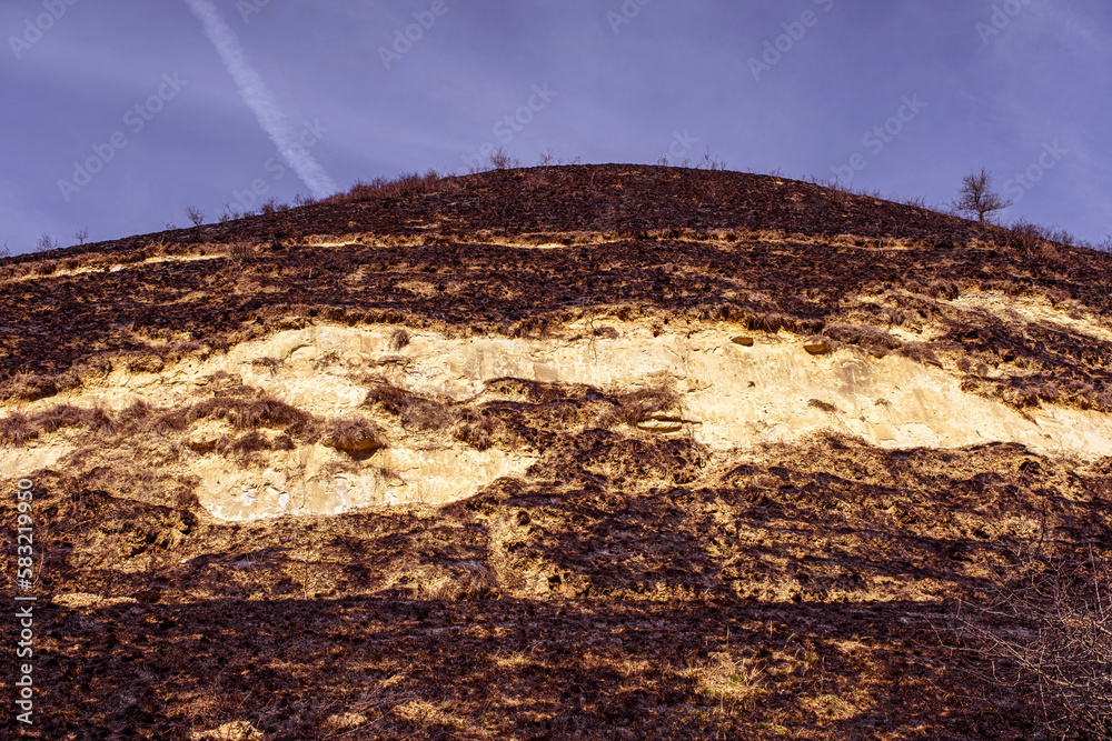 Burnt forest floor undergrowth with grass and ash, forest fire