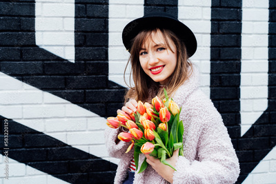 Portrait of happy. smiling young fashion woman holding bouquet of fresh tulip flowers on the painted brick wall background. Urban city street fashion. Spring positive mood. Selective focus
