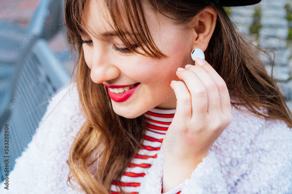 Close up of a stylish young smiling woman using white true wireless earbuds by hand to put in ear and control. Putting on earbud into the ear for listening to music and podcasts. Selective focus.