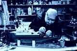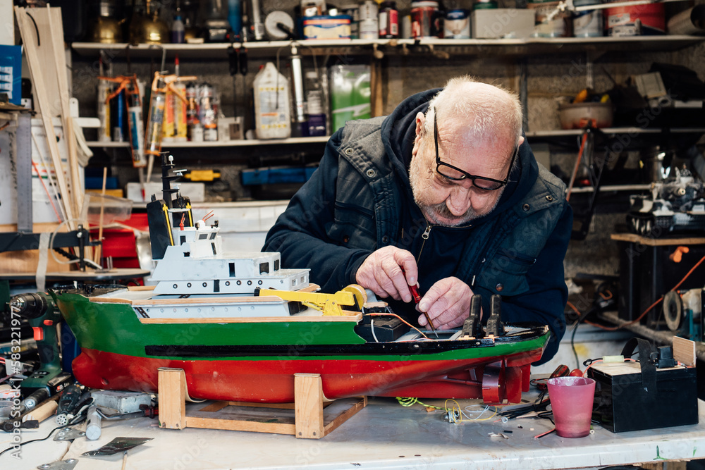 Retired elderly man making ship model building handcraft on the table in his garage. Pensioner assembling boat model with screwdriver. Active Retirement lifestyle, hobby. Selective focus.