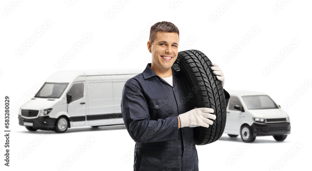 Auto mechanic worker carrying tire on shoulder and smiling at camera in front of two white vans
