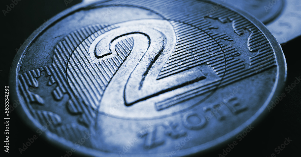 Translation: 2 zloty. Fragment of Polish two zloty coin close up. National currency of Poland. Dark blue tinted stories illustration for news about economy or finance. Money and inflation. Macro