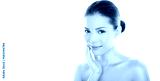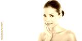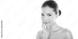 Beautiful Asian beauty woman touching perfect face skin laughing happy. Healthy skincare concept with candid smiling girl smiling at camera. Body care concept. Fresh mixed race Asian Caucasian 20s.