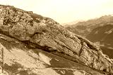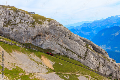 Cogwheel train climbing to the top of Mount Pilatus in Canton Lucerne, Switzerland. World's steepest cogwheel railway