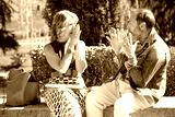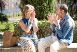 a middle-aged couple with a surprised look on their faces while sitting in the park