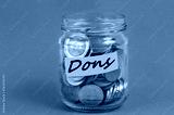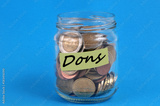 Pot en verre rempli d'argent avec une étiquette sur laquelle est écrit dons sur fond bleu