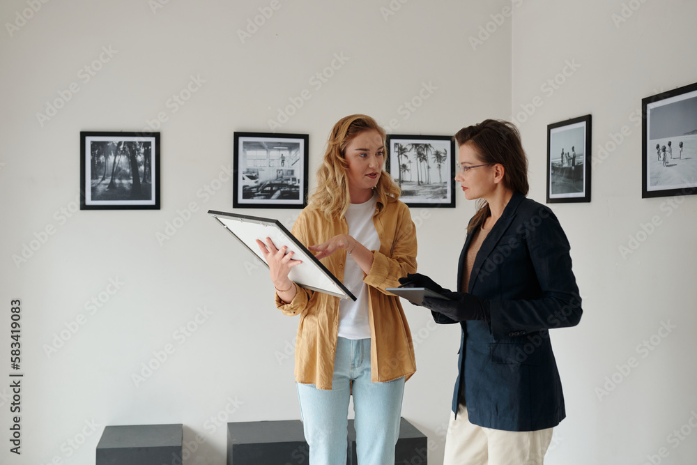Two female workers of art gallery discussing restored picture and deciding where to hang it while preparing for opening of exhibition