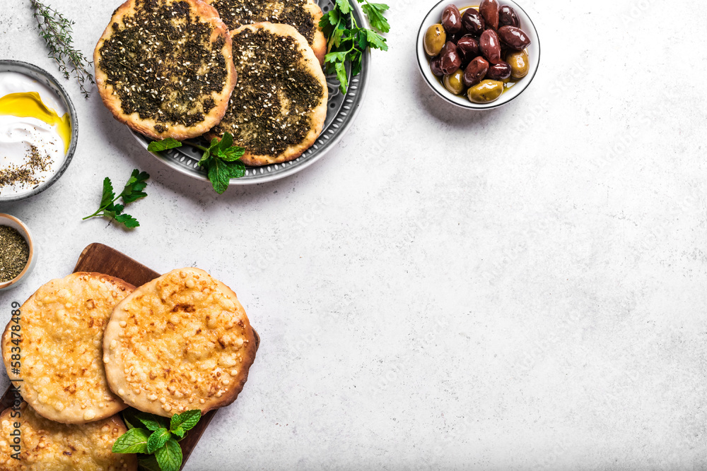 Arabic breakfast, labneh, manakeesh bread