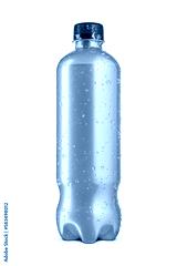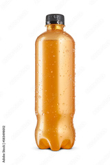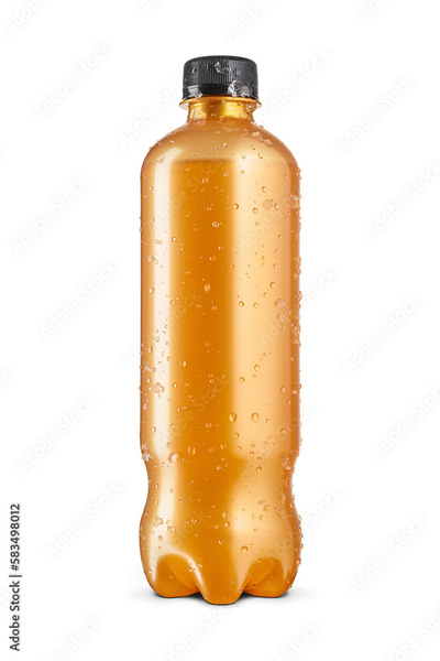 Energy drink in golden orange bottle with water condensation and ice crystals isolated on white.