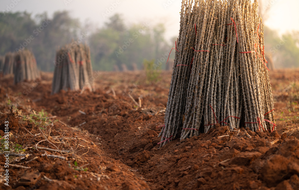 Cassava farm. Manioc or tapioca plant field. Bundle of cassava trees in cassava farm. The plowed field for planting crops. Sustainable farming. Agriculture in developing countries. Staple food crop.