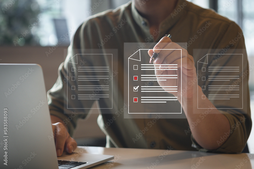 man chooses questionnaire with checkbox, survey form online, answer questions in the exam of test business checklist and filling survey form online using technology for education, learning.