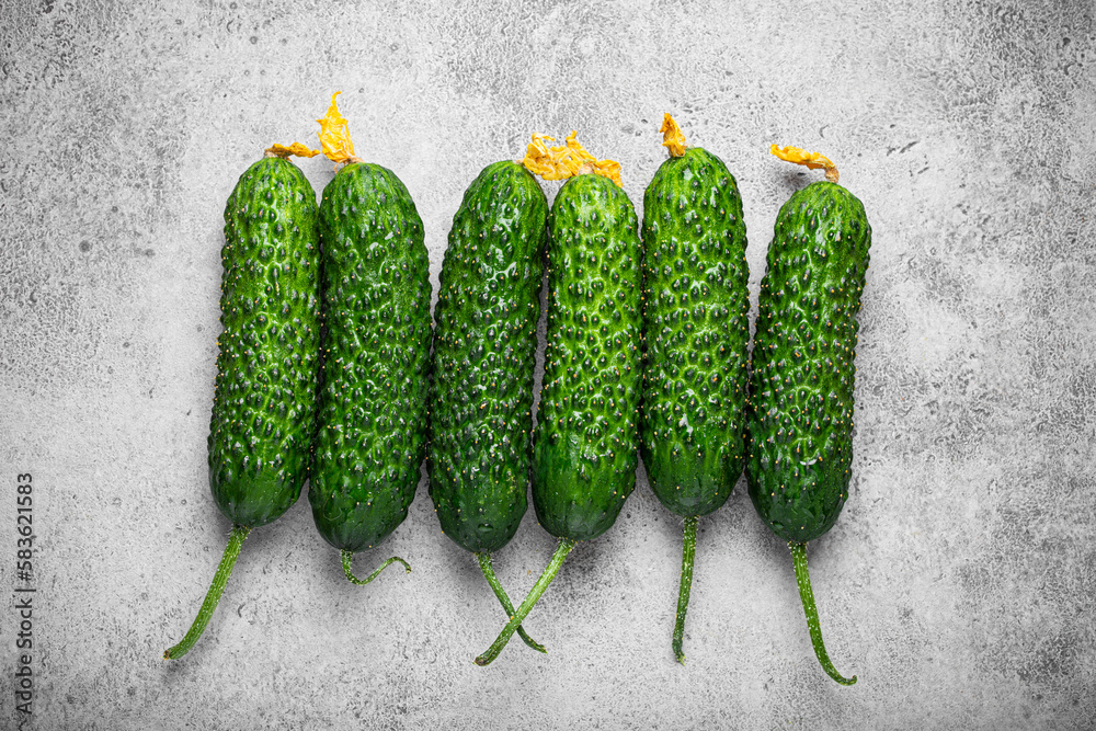 Fresh raw organic farmer cucumbers with leafs arranged on grey rustic stone background top view, healthy cucumbers in balanced nutrition and cooking concept