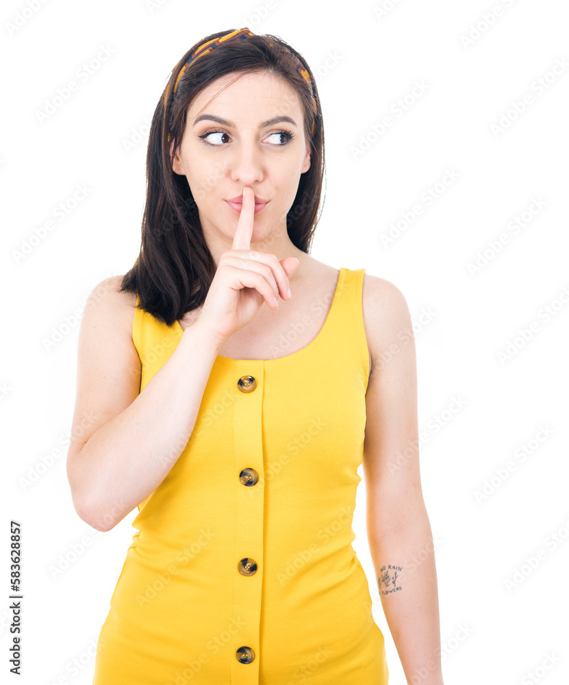 Psst. Young woman holding finger on lips, keep the secret concept, isolated on white background