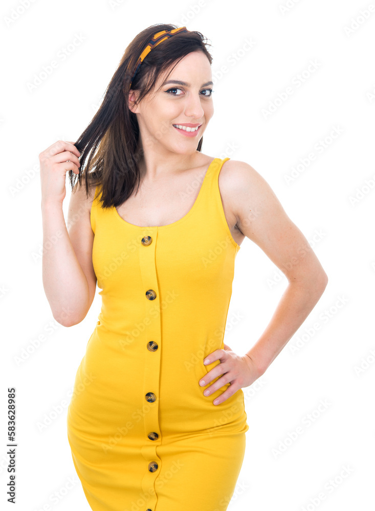 Expressive young woman posing, isolated on white background. Pretty girl. Front view