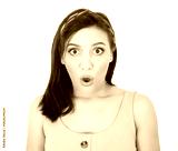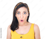 Surprised face of woman stare to camera, isolated on white background. Surprise expression face - head and shoulders of a amazed girl. Wao - omg concept