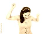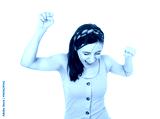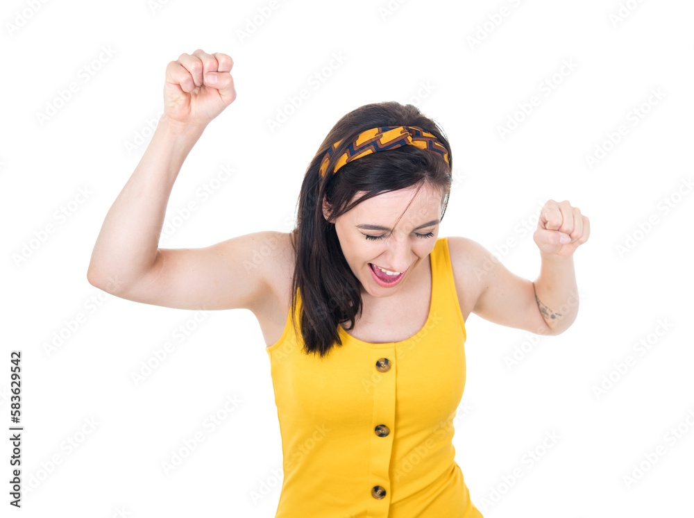Excited young woman with clenched fist or hands celebrate success, isolated on white background