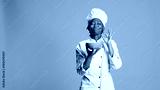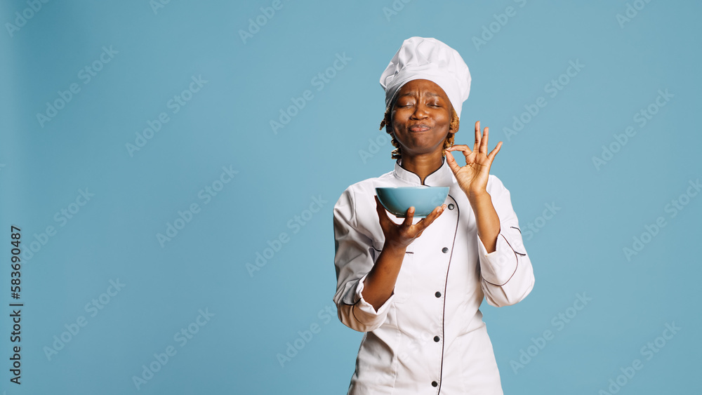 Cheerful gourmet chef smelling food aroma from bowl on camera, enjoying professional meal cooked. Professional female cook savoring tasty food, flavor and scent in studio. Catering service.
